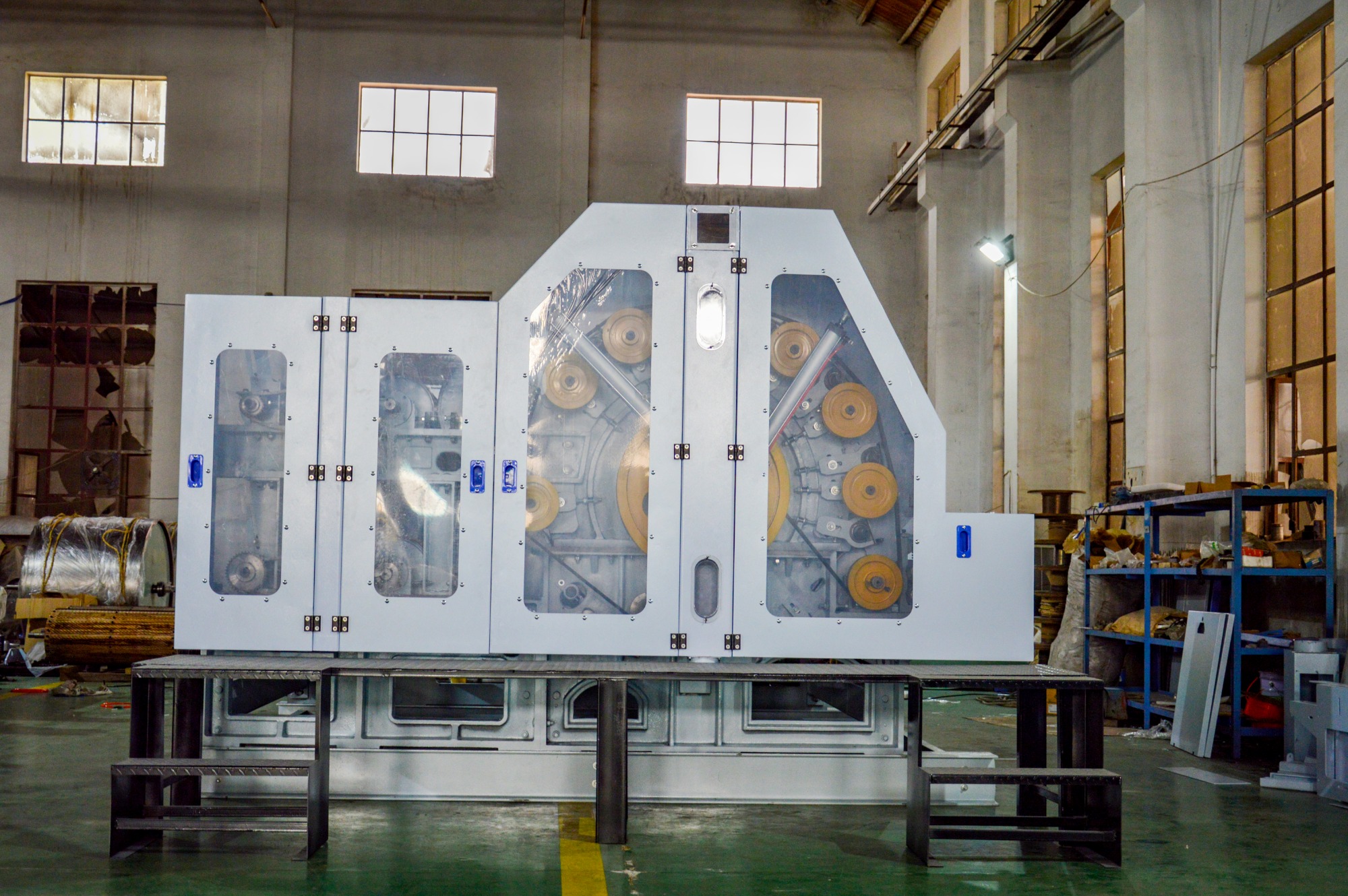 生產(chǎn)線簡介:該生產(chǎn)線主要生產(chǎn)噴膠棉。該產(chǎn)品廣泛應(yīng)用于服裝,床上用品,家具等。烘箱采用燃?xì)饧訜?,?dǎo)熱油方式,采用上吹下吸,熱風(fēng)穿透,熱風(fēng)效率高,產(chǎn)量高,最終產(chǎn)品效果好 生產(chǎn)流程:纖維→開包機(jī)→預(yù)開松機(jī)→大倉混料機(jī)→精開松機(jī)→給棉機(jī)→梳理機(jī)→鋪網(wǎng)機(jī)→烘箱→冷風(fēng)機(jī)→燙平機(jī)→收卷機(jī)→成品流程圖僅供參考,以實(shí)際客戶需求為準(zhǔn) 主要技術(shù)參數(shù):工作寬度:3000-4000mm產(chǎn)品寬度:2500-3500mm烘箱長